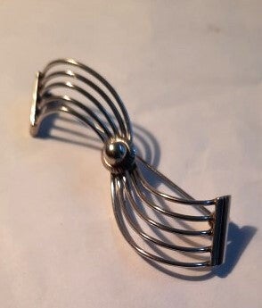 De broche heeft een unieke uitstraling door het lijnenspel en het contrast tussen de open ruimtes en het glanzende zilver.