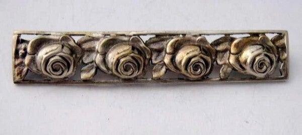 De broche toont vier gedetailleerde rozen in reliëf.