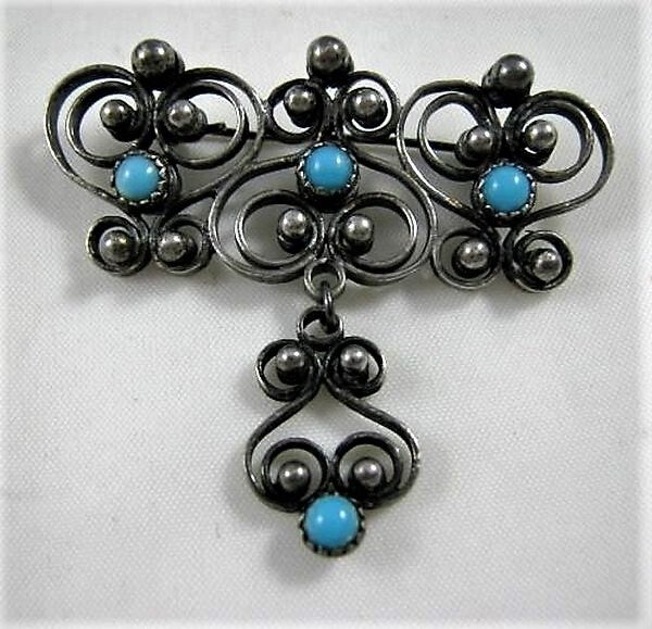 De broche is versierd met vier helderblauwe turkoois cabochons van ca. 4 mm groot.