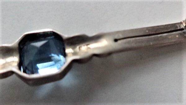 De broche is in het midden bezet met een schitterende, facetgeslepen blauwe topaas van ca. 0,85 x 0,85 mm.