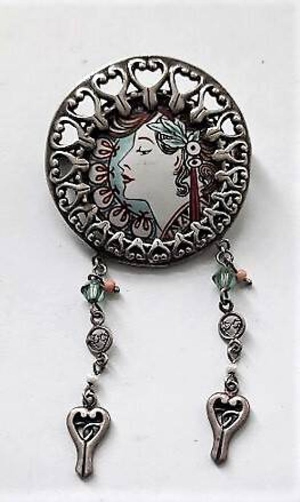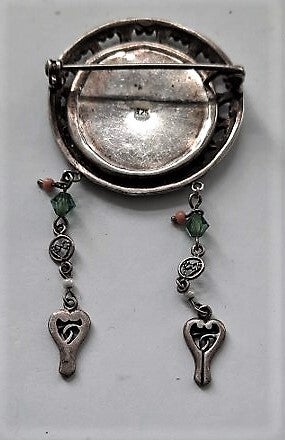 Aan de onderzijde hangen twee subtiele kettingen met kralen en hangers in de vorm van sleutels/harten, wat de broche de unieke uitstraling van een 'dromenvanger' geeft.