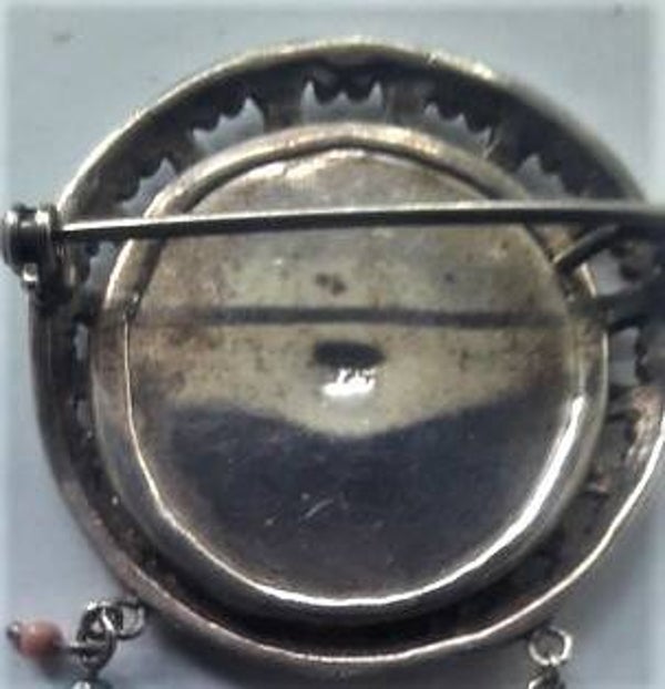 Het sieraad is een echte blikvanger met een verfijnd portret van een dame in profiel, omlijst door een sierlijk opengewerkte zilveren rand.