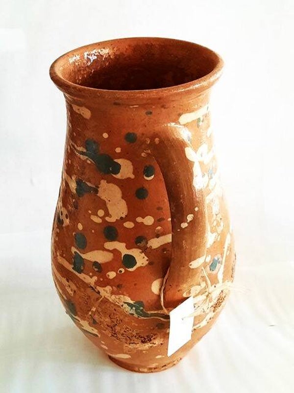 Deze karaktervolle kruik is een schoolvoorbeeld van traditioneel volksaardewerk en past perfect in een landelijk, sober of Wabi-Sabi interieur.
