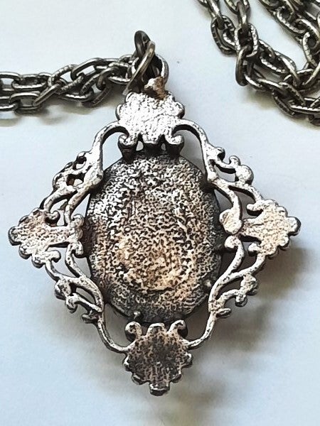 De hanger is uitgevoerd in een robuuste, zilverkleurige legering (geen zilver) met een prachtig patina.