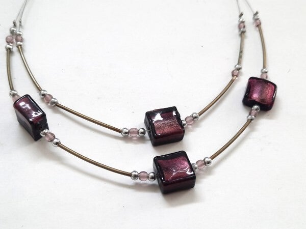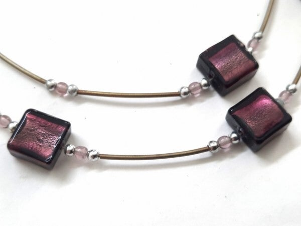 Voorzien van glanzende aubergine/paarse blokjes (11 x 11 x 6 mm), afgewisseld met elegante messing staafjes en verfijnde zilveren bolletjes.