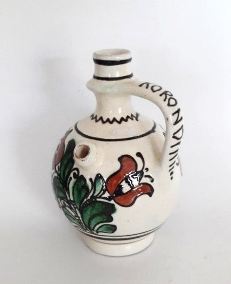 Authentieke, handgemaakte Korond (Corund, Transsylvanië) keramische kan met vogel en tulpen.