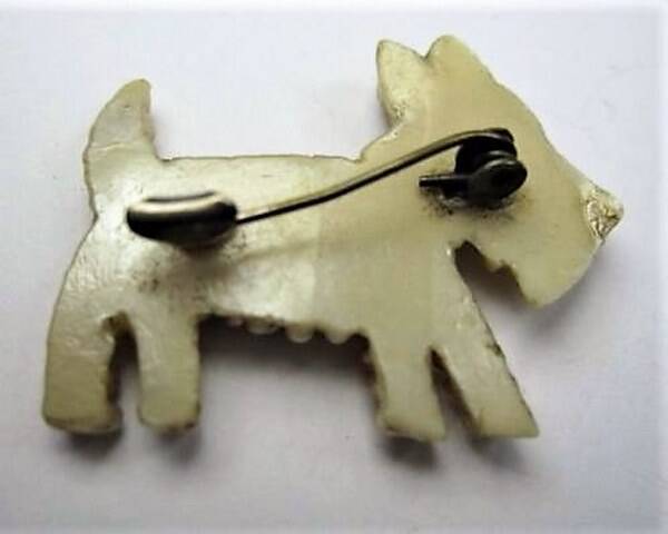 7924-5249Schattige antieke broche van een foxje.Celluloid met parelmoerglans, art deco.3,1 x 2,8 cm. Met haaksluiting.In perfecte staat.