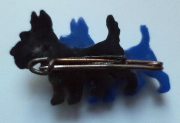 Vintage Scottie Dog broche, jaren 40 - Celluloid Duo Blauw & Zwart (6402)
