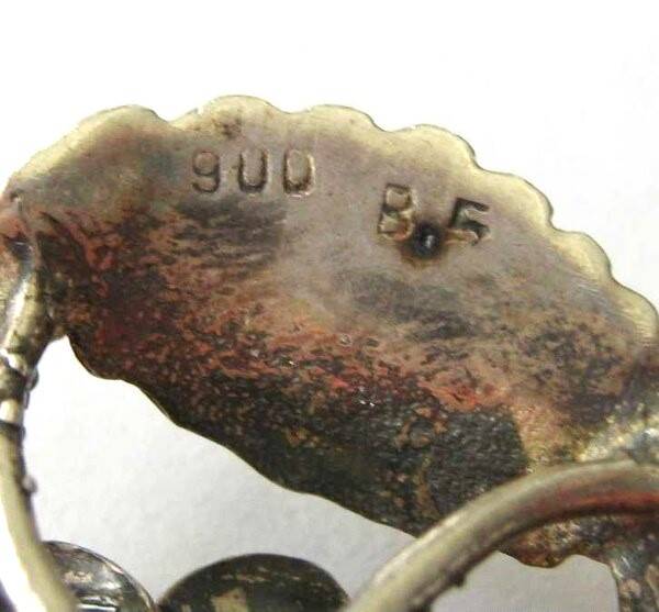 Het merkteken lijkt B S of B·5, wat kan wijzen op een kleinere regionale zilversmid, mogelijk Duits of Oostenrijks, waar 900-zilver vaker werd gebruikt.