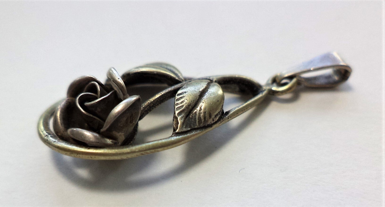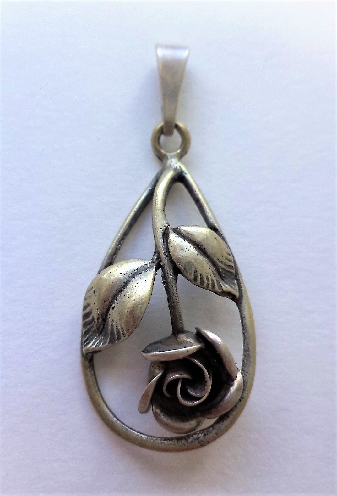 De hanger is uitgevoerd in 925 sterling zilver en heeft een opengewerkt, druppelvormig frame waarin een mooi gemodelleerde roos met twee bladeren is verwerkt.