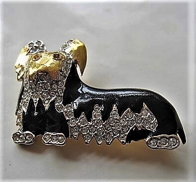 Een parmantig hondje (Scottie/Westie/Yorkie) uitgevoerd in diepzwart emaille en bezet met fonkelende kristallen.