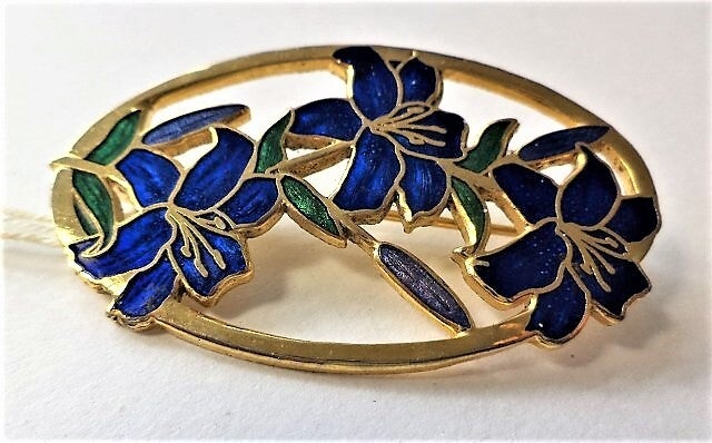 Prachtige vintage cloisonné broche met blauwe irissen.