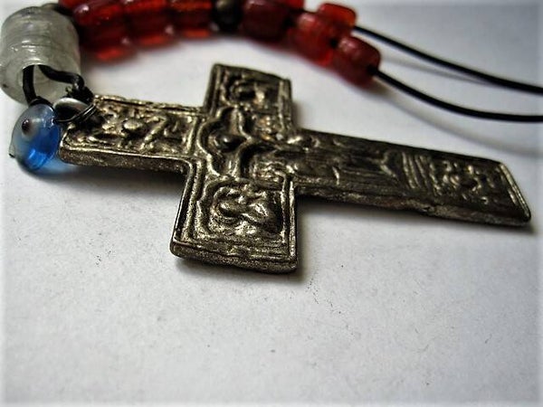 Kruis: Gedetailleerd metalen 'Penal' kruis met diverse religieuze symbolen (waaronder de ladder en de speer van de passie). Afmetingen: ca. 8,5 x 5,3 cm.