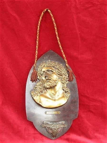Dit decoratieve stuk is voorzien van een prachtig reliëf van het hoofd van Jezus met de doornenkroon, uitgevoerd in een goudkleurig metaal (messing/brons-look).