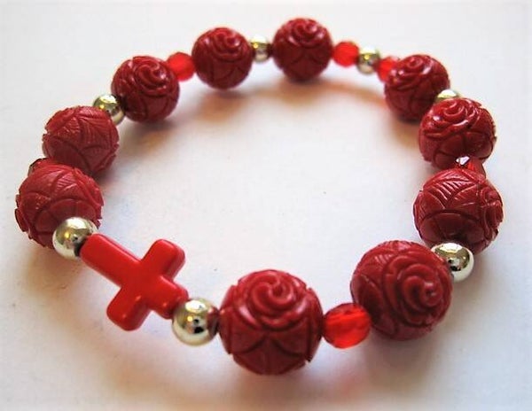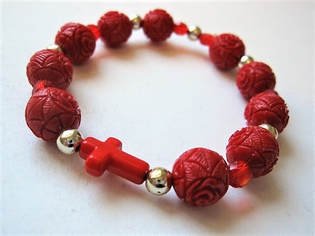 Tussen de kralen zitten zilverkleurige accenten en een bijpassend rood kruisje.