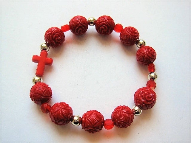Polsrozenkrans rode bewerkte kralen en kruisje (8043)