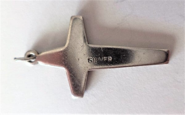 Een stijlvol zilveren hangertje in de vorm van een kruis met een bijzonder modern, driedimensionaal ontwerp.