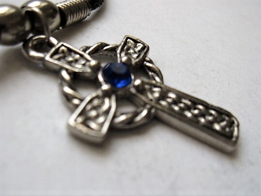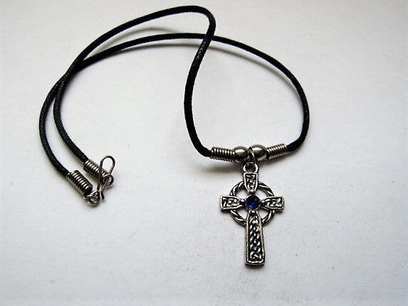 Hangertje Keltisch kruis met blauwe steen aan veterketting (8043)