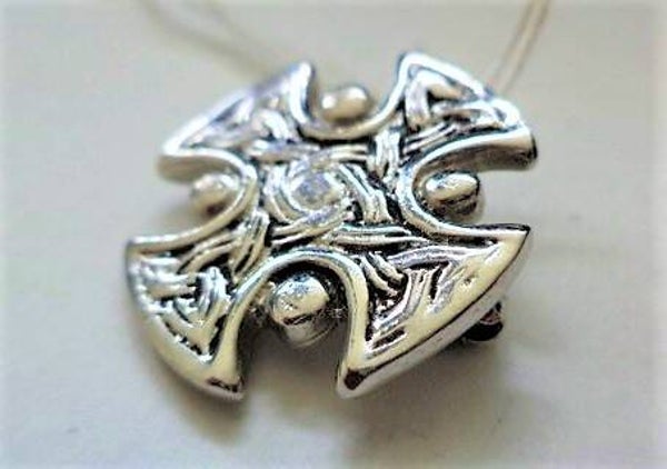 De broche heeft een gedetailleerd vlechtwerk-ontwerp (knopenwerk).