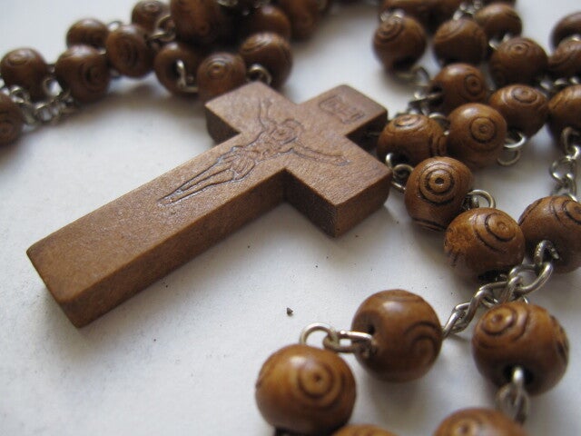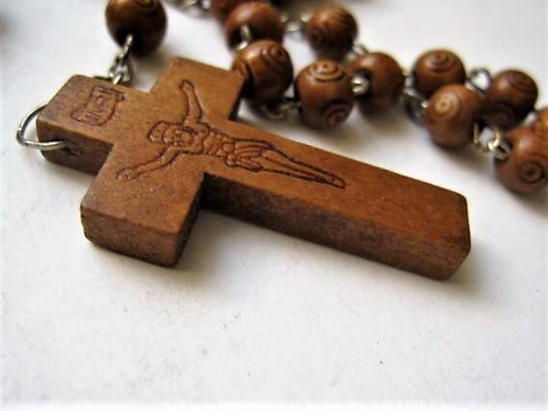 Vintage rozenkrans bewerkte houten kralen en houten kruisje (8043-109)