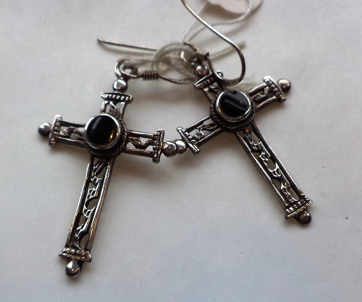 De kruisjes zijn verfijnd opengewerkt en in het hart bezet met een diepzwarte, glanzende cabochon geslepen onyx steen.