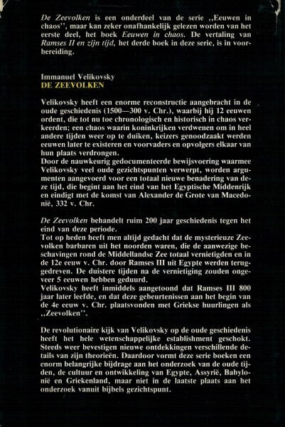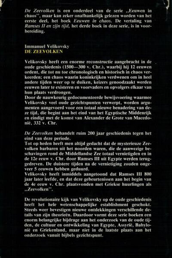 Velikovsky heeft een enorme reconstructie aangebracht in de oude geschiedenis (1500—300 v. Chr.), waarbij hij 12 eeuwen ordent, die tot nu toe chronologisch en historisch in chaos ver-keerden; een chaos waarin koninkrijken verdwenen om in heel andere tijden weer op te duiken, keizers genoodzaakt werden eeuwen later te existeren en voorvaders en opvolgers elkaar van hun plaats verdrongen.