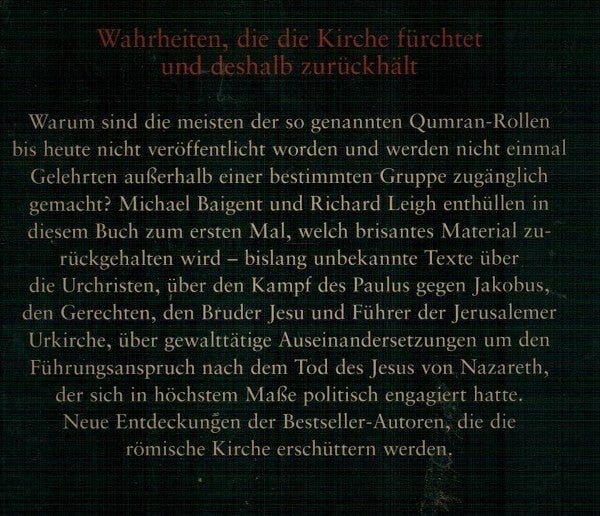 Michael Baigent und Richard Leigh enthüllen in diesem Buch zum ersten Mal, welch brisantes Material zurückgehalten wird - bislang unbekannte Texte über die Urchristen, über den Kampf des Paulus gegen Jakobus, den Gerechten, den Bruder Jesu und Führer der Jerusalemer Urkirche, über gewalttätige Auseinandersetzungen um den Führungsanspruch nach dem Tod des Jesus von Nazareth, der sich in höchstem Maße politisch engagiert hatte.