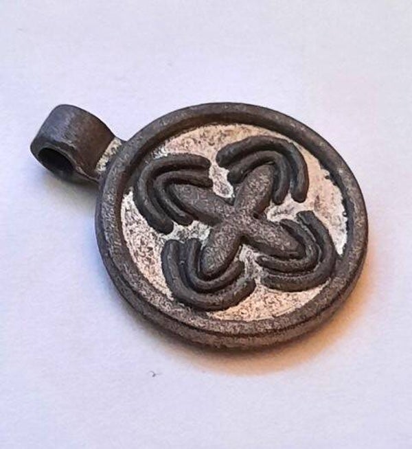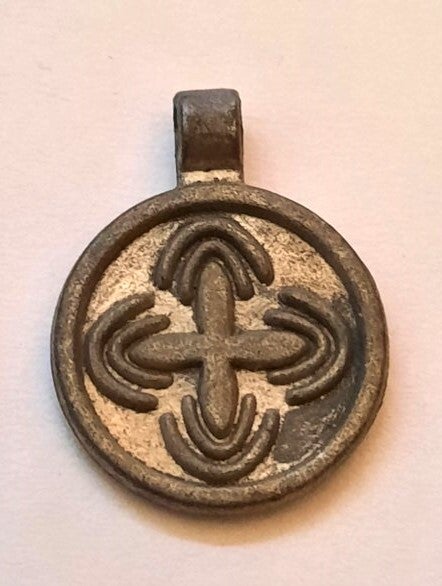 De hanger is aan beide zijden voorzien van exact hetzelfde reliëf: een centraal gelijkbenig kruis omringd door concentrische bogen, ook wel bekend als een 'zonnekruis' of 'radkruis' motief.
