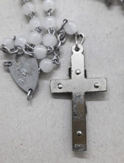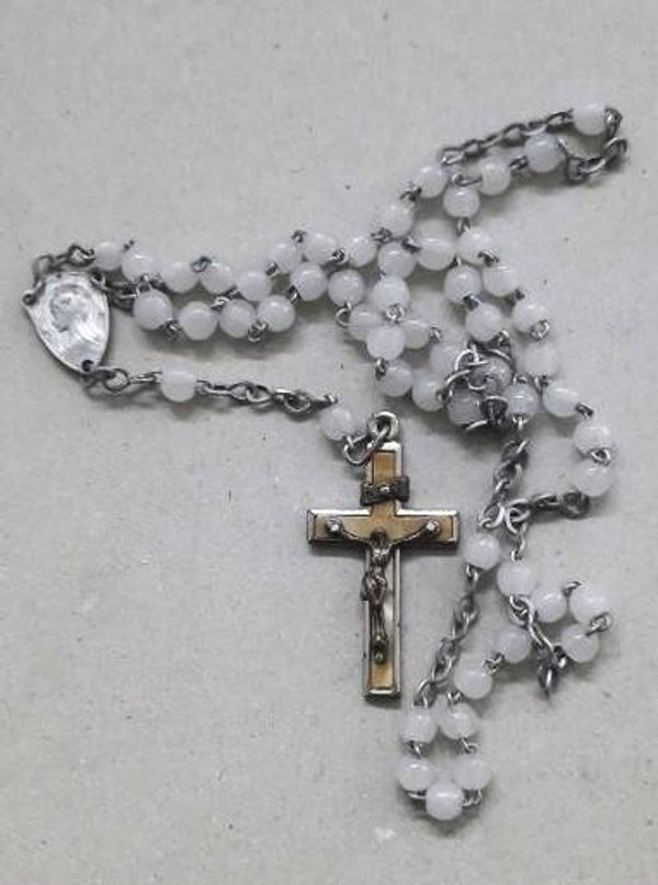 Rozenkrans wit glazen kralen en kruisje met been of kunststof (6917-80)