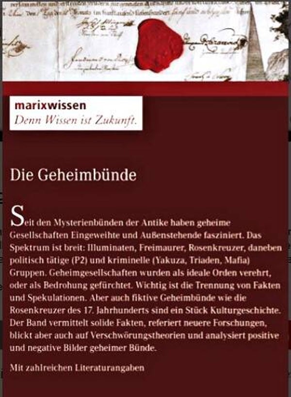 Der Band vermittelt solide Fakten, referiert neuere Forschungen, blickt aber auch auf Verschwörungstheorien und analysiert positive und negative Bilder geheimer Bünde als ein Stück Kulturgeschichte.