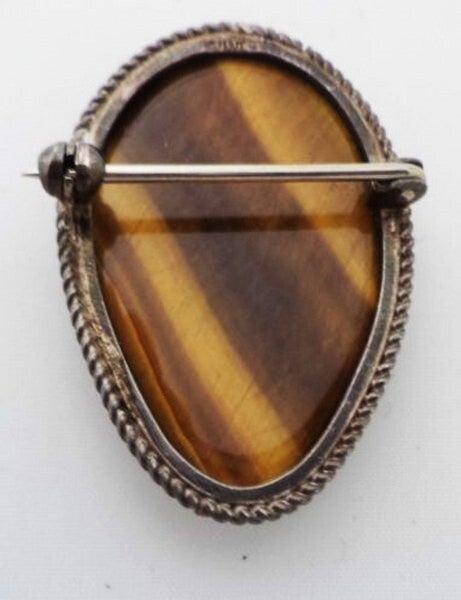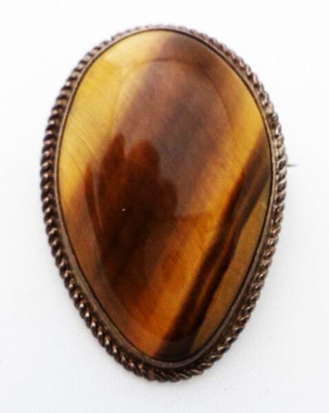 Schitterende, handgemaakte vintage broche van zilver, gezet met een grote tijgeroog edelsteen in een elegante druppelvorm.