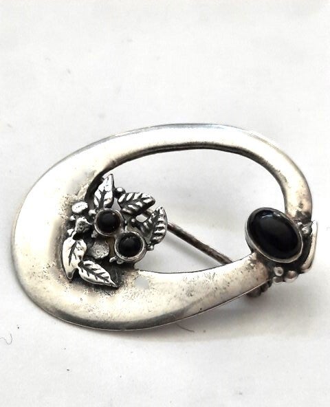 De broche heeft een opengewerkte ovale vorm, versierd met gedetailleerde blaadjes en drie zwarte onyx edelstenen (twee kleine "bessen" en één grotere ovale steen).